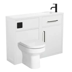 The stylish space saving Arezzo matt teal green semi-recessed basin bathroom combination unit, perfect for renewing the style in any cloakroom, en-suite or smaller bathroom where space limited. It’s stylish modern design hides all unsightly pipework creating a neat modern look, provides ample storage, perfect for a busy family bathroom. Features a eye catching matt teal green finish, contemporary polished chrome square bar handles, concealed cistern with polished chrome flush button and a solid round semi-recessed poly-marble basin with worktop.
