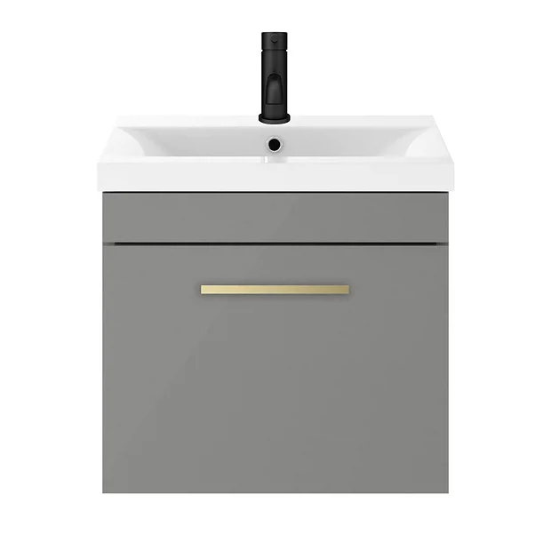 Arezzo 500 Matt Grey Wall Hung 1-Drawer Vanity Unit with Ceramic Mid-Edged Basin + Brushed Brass Handle