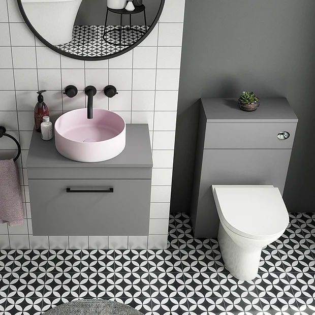 The contemporary matt grey Arezzo furniture package, with it’s clean lines this suite is perfect for renewing the style in any bathroom. The vanity unit’s stylish modern design hides all unsightly pipework creating a neat modern look, helping to keep your bathroom clutter free. Features eye-catching and stylish matt grey finish with a on-trend contrasting modern matt pink round counter top basin and a square matt black bar handles. WC unit comes supplied with a dual flush concealed WC cistern and modern toilet with soft closing seat.