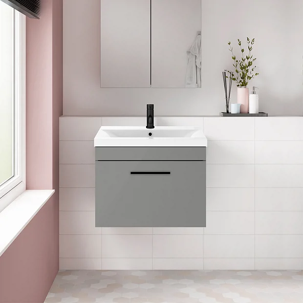 Arezzo 600 Matt Grey Wall Hung 1-Drawer Vanity Unit with Ceramic Mid-Edged Basin + Matt Black Handle