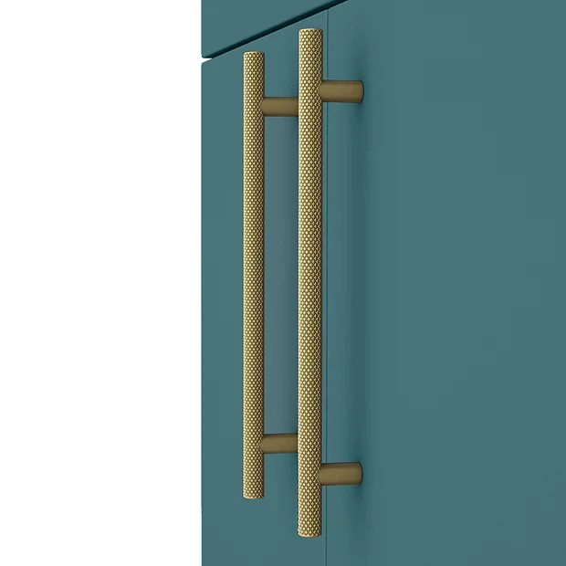The contemporary matt green Arezzo Industrial style furniture range, with it’s simple design this vanity unit is perfect for renewing the style in any bathroom. It’s stylish modern design hides all unsightly pipework creating a neat modern look. The units soft-closing doors provides plenty of storage space for toiletries. Features an eye-catching and stylish matt teal green finish with on-trend round brushed brass knurled detail handles, great for creating an eye catching industrial look in your bathroom. Supplied with a quality 1 tap hole rectangular mid-edge ceramic sink.