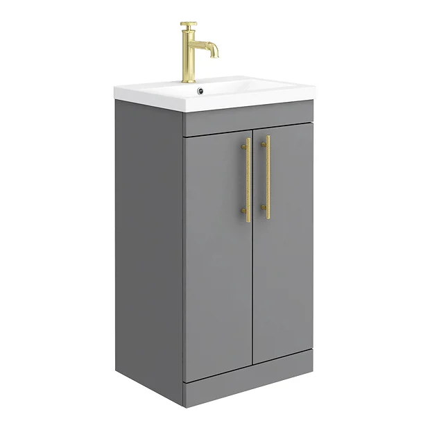 Arezzo Industrial Style 500 Matt Grey Floor Standing Vanity Unit with Ceramic Mid-Edged Basin + Brushed Brass Knurled Round Handles