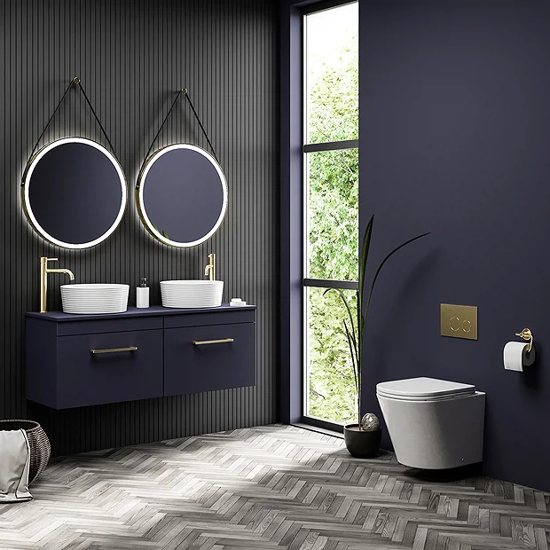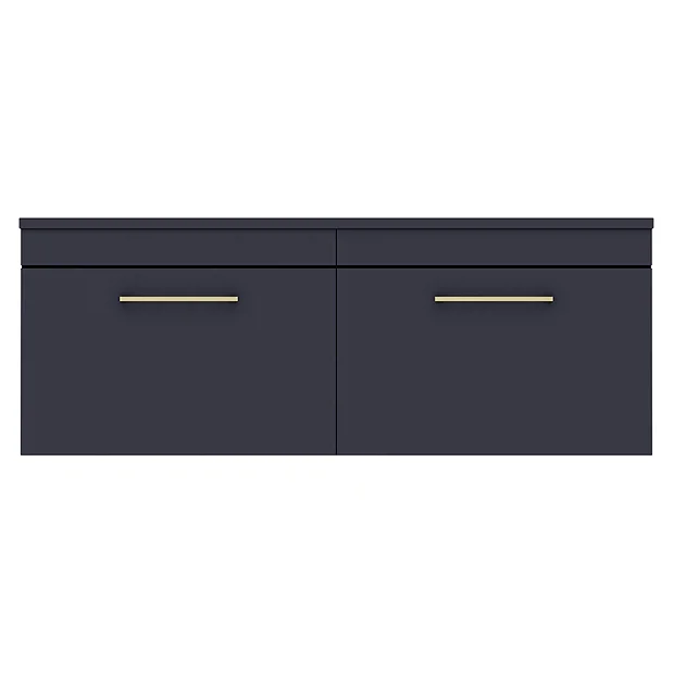 Features an eye-catching and stylish matt blue finish with a pair of on-trend modern brushed brass square bar handles. This space-enhancing wall-mounted matt blue vanity with counter top basins will look especially smart with a matching Arezzo brushed brass high rise tap to really emphasis the contemporary look.