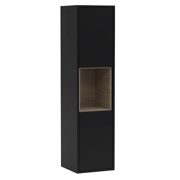 The Arezzo matt black bathroom furniture range combines up to date looks with practical storage. This wall hung tall unit features push open doors and an open shelf to complement the fascia choice and provide immediate access to your bathroom necessities. The Arezzo wall hung tall storage cabinet is perfect for adding modern style to any bathroom.