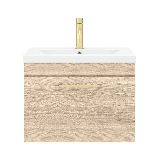 Arezzo 600 Rustic Oak Effect Wall Hung 1-Drawer Vanity Unit with Ceramic Mid-Edged Basin + Brushed Brass Handle