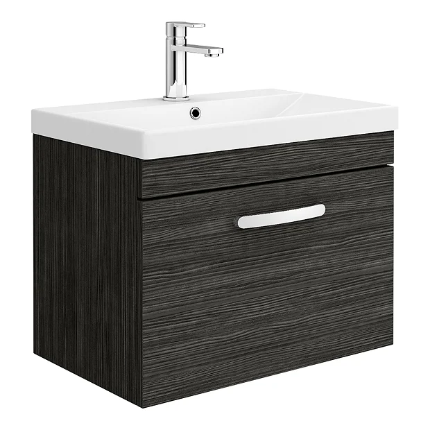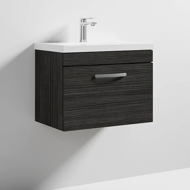 This 600mm wall hung vanity unit creates more space in your bathroom giving the illusion of a bigger bathroom, features a soft close drawer which provides plenty of storage space for toiletries, the Brooklyn wall hung vanity unit is perfect for adding modern style to any bathroom. This high quality Black textured wood effect vanity unit is supplied with a sleek white gloss thin-edge ceramic basin and a quality matt chrome handle.