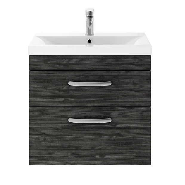 The Brooklyn modular furniture range combines up to date looks with practical storage. Features 2 soft closing drawers providing plenty of space for toiletries, the Brooklyn wall hung vanity unit is perfect for adding modern style to any bathroom. This high quality Black Woodgrain textured wood effect vanity unit is supplied with a smooth white gloss vitreous china basin. All units are come with quality matt chrome handles.