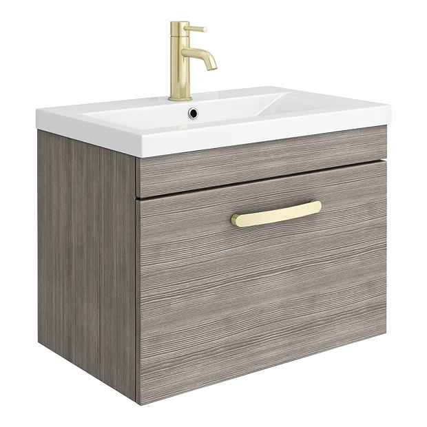 The Brooklyn modular furniture range combines up to date looks with practical storage. Features a soft closing drawer providing plenty of space for toiletries, the Brooklyn wall hung vanity unit is perfect for adding modern style to any bathroom. This high quality grey avola textured wood effect vanity unit is supplied with a smooth white gloss vitreous china basin and a quality brushed brass handle.