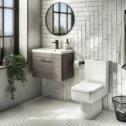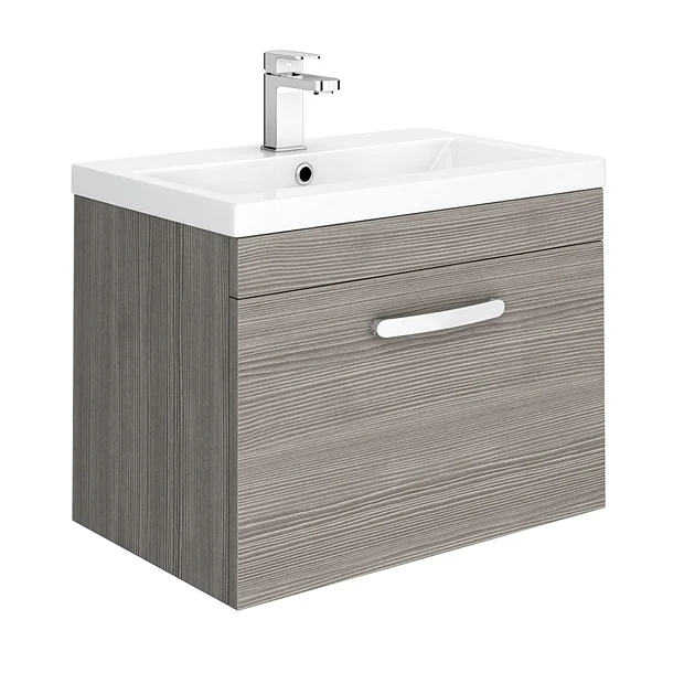 Combining contemporary style with impressive functionality, the Brooklyn Grey Avola Wall Hung Vanity Unit is designed with modern bathrooms in mind. Use the matt chrome strap handle to slide open the soft closing drawer revealing plenty of space to store your toiletries. The textured wood effect of this 610mm wide Grey Avola vanity unit will add warmth to your room. It creates a striking contrast with the smooth white sink, which is crafted from vitreous china for impressive durability. For a unified look, match this modular furniture piece with the practical Brooklyn Grey Avola Bathroom Mirror Cabinet.