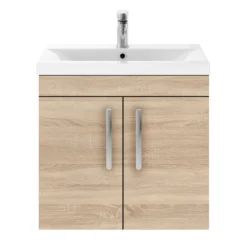 The Brooklyn Natural Oak modular furniture range combines up to date looks with practical storage. Features 2 soft close doors and provides plenty of storage space for toiletries, the Brooklyn wall hung vanity unit is perfect for adding modern style to any bathroom. This high quality Natural Oak textured wood effect vanity unit is supplied with a smooth white gloss vitreous china basin. All units are provided with quality matt chrome handles.