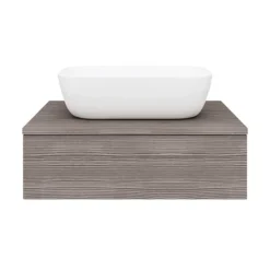 Finished in high quality grey brown avola textured wood effect and with it’s clean lines this vanity unit is perfect for renewing the style in any bathroom. Supplied with a gloss white curved rectangular counter top basin, its stylish modern design hides all unsightly pipework creating a neat modern look. A soft closing drawer provides generous storage space for your toiletries, helping to keep your bathroom clutter free. Unit features a eye-catching stylish textured wood effect finish, basin has been designed for use with extended tall basin mixers or wall basin mixers.