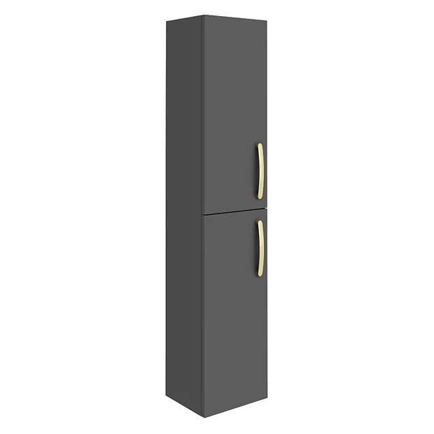 The Brooklyn modular furniture range combines up to date looks with practical storage. It features two soft close doors and provides plenty of space for toiletries, the Brooklyn wall hung tall storage cabinet is perfect for adding modern style to any bathroom. This high-quality gloss grey cabinet is supplied with quality brushed brass handles and wall fixings.