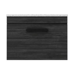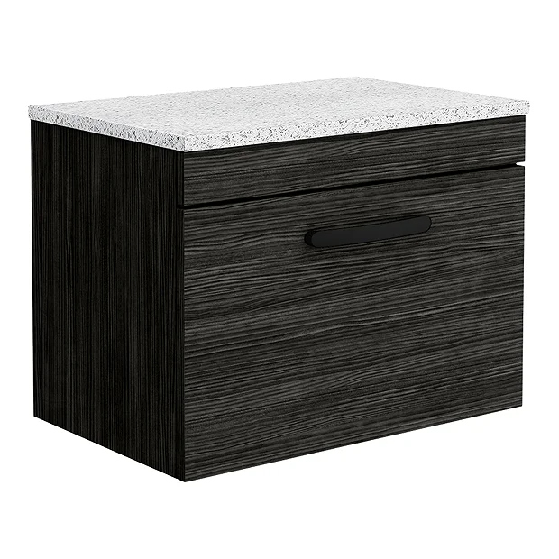 The contemporary Brooklyn furniture range, with it’s clean lines this vanity unit is perfect for renewing the style in any bathroom. Designed for use with a counter top basin (not included), the sparkling white worktop sits perfectly on top and all pipework is neatly concealed within the unit. A soft closing drawer provides generous storage space for your toiletries, helping to keep your bathroom clutter free. Features a eye-catching stylish textured wood effect finish with a on-trend modern matt black handle.