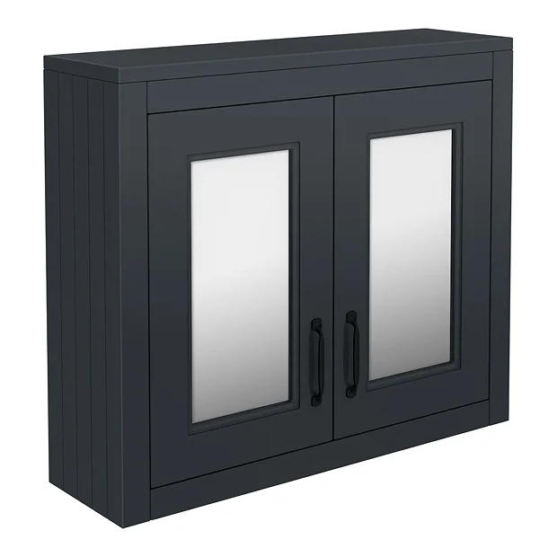 Embrace a traditional interior style in your bathroom with the Chatsworth Graphite Two Door Mirror Cabinet. The tongue and groove side panelling and chic satin graphite create a countryside elegance. It features classic handles with a matt black finish. More than just a design feature – the Chatsworth bathroom cabinet has plenty of space for your cosmetics and soft closing doors for a peaceful environment. Pair your wall hung bathroom mirror cabinet with the Chatsworth Traditional Graphite Vanity for a matching look in your bathroom.