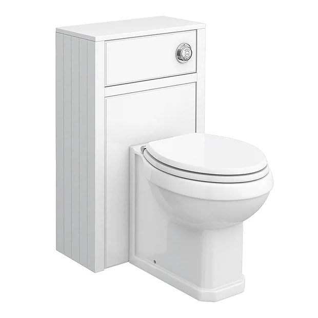 The Chatsworth traditional 500mm wide back to wall toilet unit, Victorian inspired design with a modern twist. The Chatsworth range of charming bathroom furniture features classic styling with a satin white finish and tongue-and-groove side panelling.