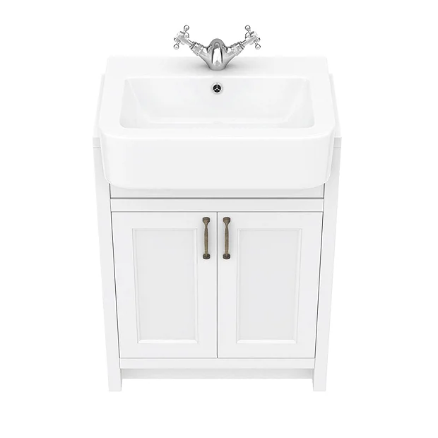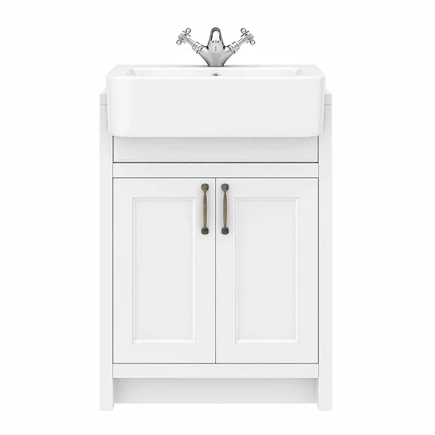 The eye-catching Chatsworth traditional 600mm wide white vanity unit with a gloss white semi-recessed basin, Victorian inspired design with a modern twist. The Chatsworth range of charming bathroom furniture features classic styling with a satin white finish cabinet and tongue-and-groove side panelling. The semi recessed basin will half sit in your unit.