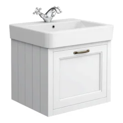 The Chatsworth traditional tall bathroom cabinet, Victorian inspired design with a modern twist. The Chatsworth range of charming bathroom furniture features classic styling with a satin white finish and tongue-and-groove side panelling.