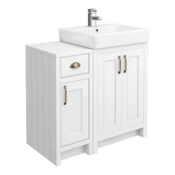 The Chatsworth traditional 610mm wide white vanity unit with marble basin top, Victorian inspired design with a modern twist. The Chatsworth range of charming bathroom furniture features classic styling with a satin white finish cabinet, tongue-and-groove side panelling and sturdy matt black handles.