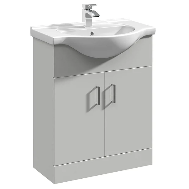 A 650mm wide high gloss light grey free standing vanity unit with a quality smooth ceramic basin top, part of the Cove range of bathroom furniture. Features 2 soft closing doors with modern chrome door handles. Provides generous storage space for your toiletries, helping to keep your bathroom clutter free. Ideal for giving your bathroom a fresh clean modern look.