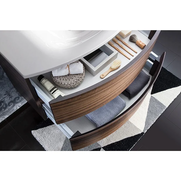 The Svelte furniture range is sleek and versatile with units coming in various sizes to suit any bathroom layout. This two drawer vanity unit and basin comes in a beautiful American Walnut finish and features sumptuous curves. Its handleless design gives it a simplistic look whilst the anti-bacterial finish gives a clean and hygenic surface. The stylish Durocoat cast mineral basin tops the unit and comes in a stunning white high gloss finish.