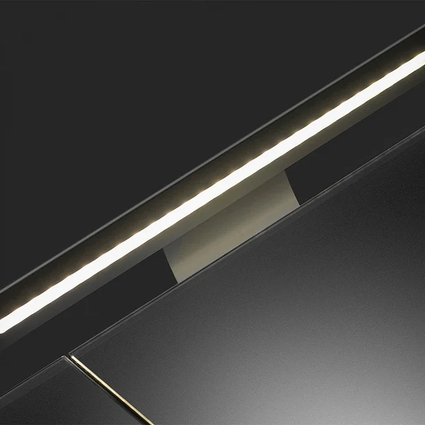 For added ambiance, the energy efficient LED lighting bar cloaks the bathroom in a warm light, providing a luxe focal point.