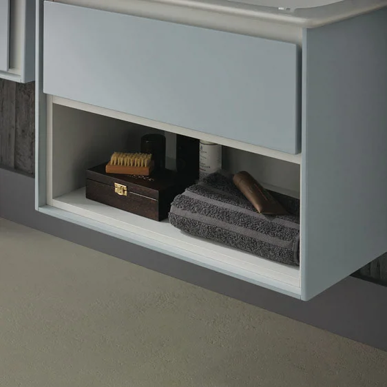 The Connect Air wall hung vanity unit with open shelf will create a luxury look and feel in any contemporary bathroom. The unit features an open shelf and soft close drawer. Its beautiful integrated recessed handle has been crafted to bring a touch of class to your bathroom.