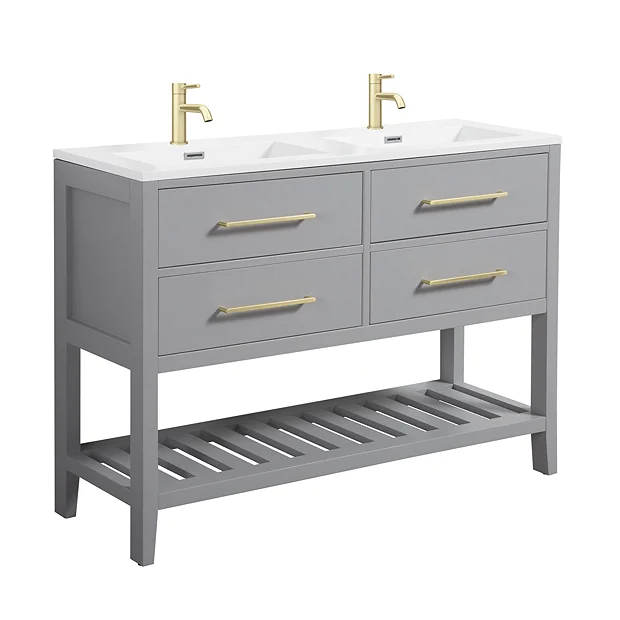 Montrose 1200mm Floor Standing Vanity Unit in Dove Grey with Brushed Brass Handles, Slatted Shelf and Double Stone Resin Basin