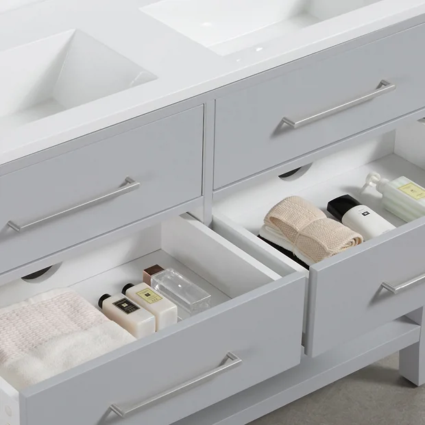 The satin dove grey finish and sleek design will turn your bathroom into an elegant, modern space. Create an effortless look and enjoy the convenience of having everything you need in one place. Coordinating mirrors are available to complete your bathroom interior.