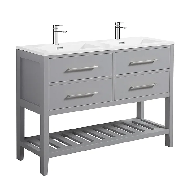 Montrose 1200mm Floor Standing Vanity Unit in Dove Grey with Chrome Handles, Slatted Shelf and Double Stone Resin Basin