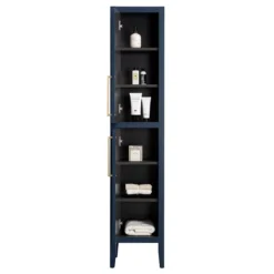 Introducing the Montrose Furniture Collection – the perfect combination of style and functionality for your bathroom. This satin indigo blue 1600mm tall storage unit with brushed brass handles and two soft-closing doors is an essential addition to any bathroom.