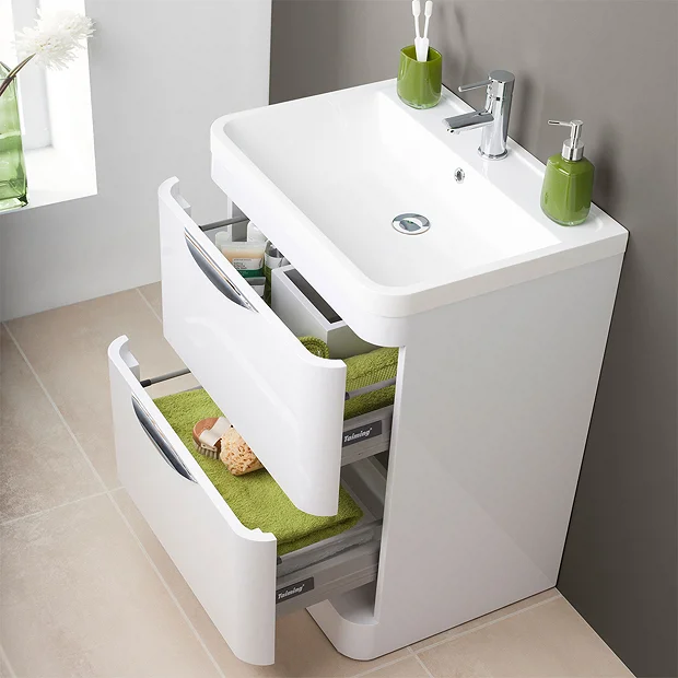 Need an elegant piece to complete a contemporary bathroom? Choose the Monza Floor Standing Vanity Unit, featuring sleek rounded corners and a bright gloss white finish. This 600mm wide vanity is not all about looks though – its integrated polymarble basin is also spacious and scratch resistant. The two drawers of this freestanding vanity unit offer plenty of space to store towels or toiletries, while their soft close mechanism prevents any loud banging noises when they swing shut. Opt for a Monza Waterfall Basin Tap to tie in with the chrome effect handles of this basin vanity unit.