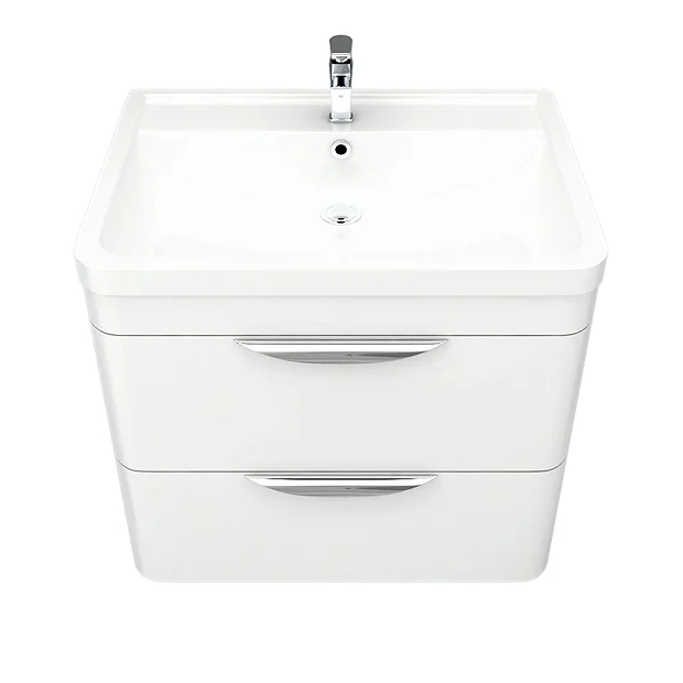 Monza Gloss White 600 x 445mm Wall Hung 2 Drawer Vanity Unit with Modern Chrome Pull Handles and Polymarble Basin