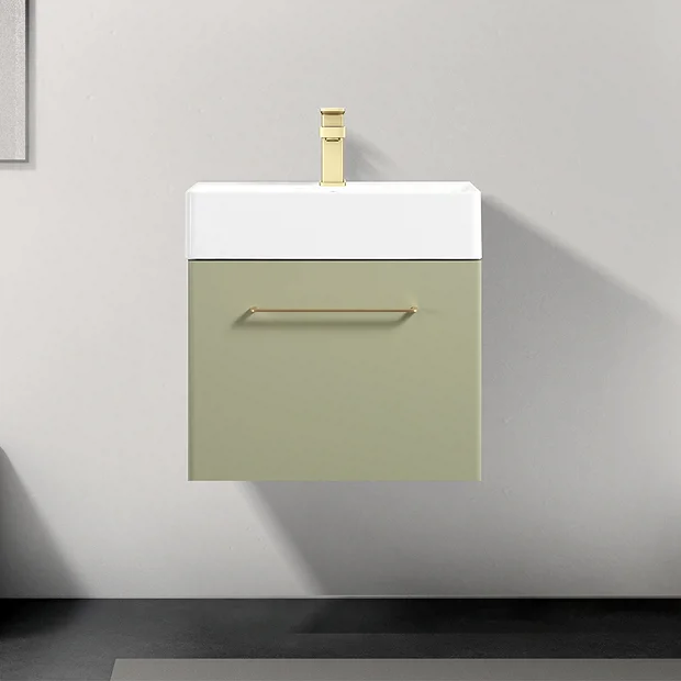Odyssey 600mm Wall Hung 1-Drawer Vanity Unit in Sage Green with Brushed Brass Handle