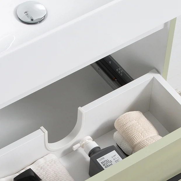 This Odyssey Sage 1 Drawer Vanity Unit is a stunning addition to any bathroom. With its subtle curved corners and a slimline elegant, matt black handle, this vanity unit is sure to make a statement. Made from high quality material with a matt sage green finish, this vanity unit is designed to be durable and easy to clean. The single drawer provides ample storage space and features soft-close technology, which ensures a smooth, close every time. With its combination of style and convenience, this Odyssey Sage 1 Drawer Vanity Unit is the perfect addition to any bathroom. Co-ordinating furniture is also available, so you can easily create a cohesive and stylish look.