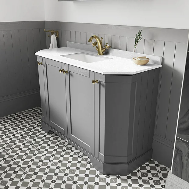Old London furniture is the epitome of traditional design. This Art Deco styled Storm Grey 1000mm Angled Cabinet features soft close doors which limits the daily wear and tear and provides a quieter closing action. The luxury White polished marble top achieves a timeless, classic look. Ideal for creating a period look in your bathroom this furniture range with it’s clean classical design blends beautifully with Old London’s range of traditional bathroom furniture.