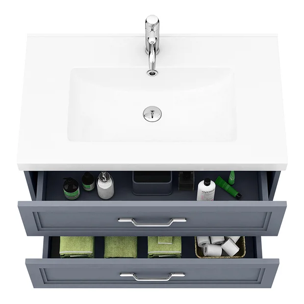Provide a beautiful finishing touch in your bathroom with the Period Bathroom Company traditional 800mm 2 drawer wall hung satin grey vanity unit with gloss white basin top. Victorian inspired design with a modern twist, a great alternative to the basin and pedestal, The Period Bathroom Company’s range of charming wall hung bathroom furniture features classic styling with a satin finish cabinet and traditional polished chrome strap design handles. The 2 soft-closing drawers eliminate slams and provide generous storage space for your toiletries, helping to keep your bathroom clutter free.