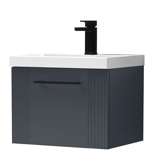 Roxbury Deco Fluted 500mm Anthracite Grey Vanity Unit – Wall Hung Single Drawer Unit with Thin-Edged Ceramic Basin and Matt Black Handle