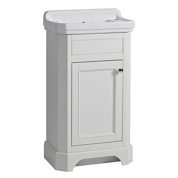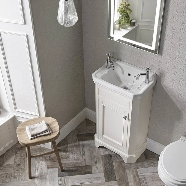 Elegant and timeless, the Vitoria 500mm cloakroom unit and basin is ideal for a cloakroom or en-suite. The unit is beautifully crafted from solid wood and hand painted in Linen White. It features a soft close door with an elegant chromed knob handle. The basin is made from high grade ceramic and finished in a gloss white and features 2 tap holes, integrated overflow and a hole for a chain stay. Team it with a coordinating Vitoria WC to complete the look.