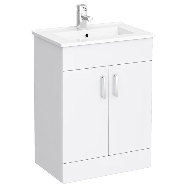 The Toreno Vanity Sink with Cabinet is part of a modern range of white bathroom furniture. The ceramic bathroom sink complements the bright gloss finish of the 600mm-wide unit underneath, with sleek chrome handles emphasising its contemporary look. Inside the soft close cupboard doors you’ll find two practical compartments that are ideal for storing your bathroom essentials.