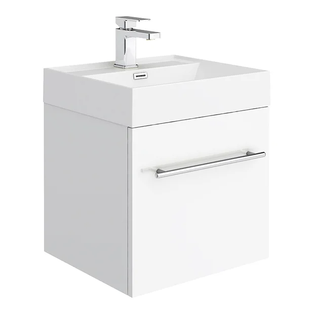 Valencia 450 Gloss White Minimalist Wall Hung 1-Drawer Vanity Unit with Polymarble Basin and Chrome Handle