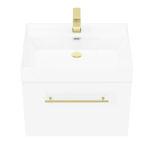 Valencia 600 Gloss White Minimalist Wall Hung 1-Drawer Vanity Unit with Polymarble Basin and Brushed Brass Handle