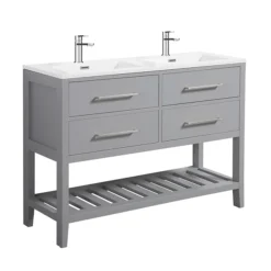 Montrose 1200mm Dove Grey Double Basin Vanity Unit With Brushed Brass Handles And Slatted Shelf