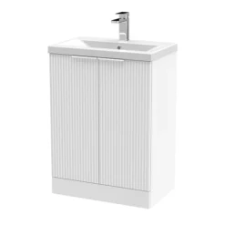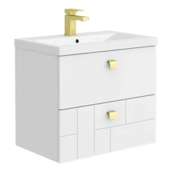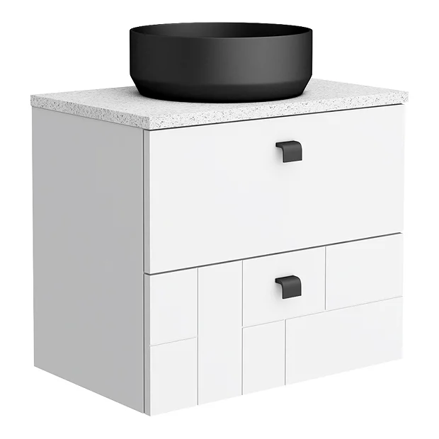 The Venice Abstract 600mm White 2-Drawer Wall Hung Vanity Unit with White Quartz Effect Worktop and Matt Black Round Basin features an eye-catching geometric design that will create a style statement in your bathroom. It has ample storage with two large soft-closing drawers to keep your toiletries organised.
