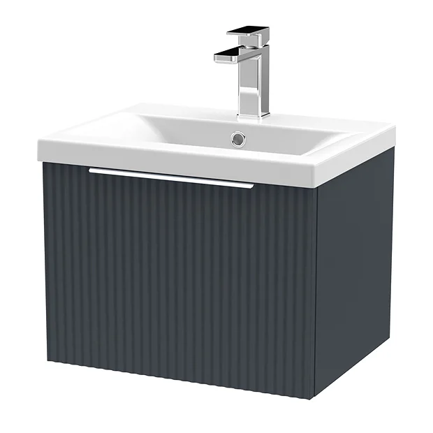 Create an Art Deco inspired bathroom with the Venice Fluted 500mm Satin Anthracite Single Drawer Wall Hung Vanity Unit. The units striking fluted front adds a modern twist. It has ample storage with its large soft-closing drawer to keep your toiletries organised. The mid-edged ceramic basin slots perfectly on top and all pipework is neatly concealed within the unit. Manufactured from quality materials, this vanity unit comes fully assembled and is finished in Grey Anthracite.
