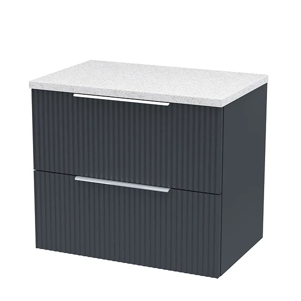 Venice fluted 600mm Satin Anthracite Vanity Unit – Wall Hung 2 Drawer Unit with Sparkling White Quartz Effect Worktop & Chrome Handles