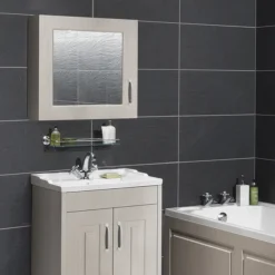 A traditional-style bathroom cabinet, the chic stone grey woodgrain finished York mirror cabinet features a single mirrored door with a satin chrome handle and a internal shelf providing plenty of space for all your toiletries.